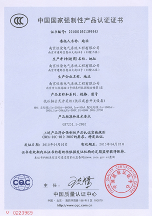 低壓抽出式開關(guān)柜CCC認(rèn)證
